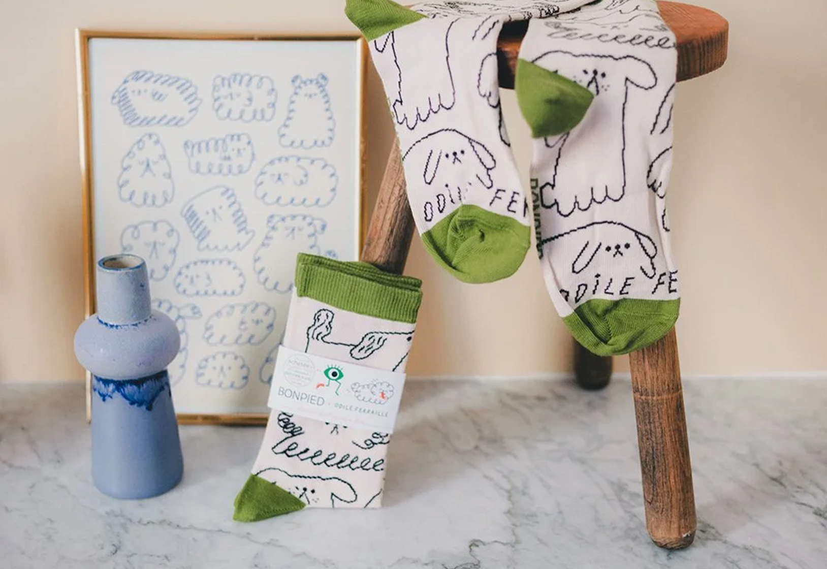 Les chaussettes Odile, signées Bonpied x Odile Ferraille, mêlent un motif chien arty et plein d’humour à une fabrication 100 % française. Jolies, confortables, et faciles à porter au quotidien.